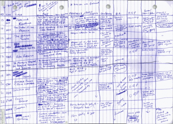 If your dream is to create an entire universe comprised of several books, an outline will probably not be enough. For her Harry Potter series, JK Rowling used a handwritten spreadsheet to keep everything straight, dividing columns by chapter number and title, organizing by month, and delineating between main plot, primary subplot, and secondary subplots.