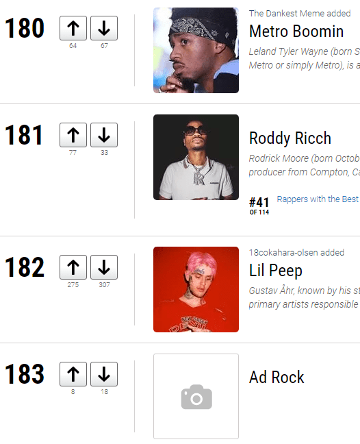 Fellow pioneer and legend KRS-One sits at 150th, one spot below DaBaby while Metro Boomin, who doesn’t even rhyme, sits at 180th, three spots above Ad Rock, for whom they don’t even have a photo.