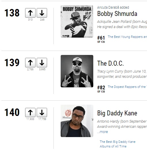 The D.O.C. and Big Daddy Kane are 139th and 140th, respectively, behind – no joke – Bobby Shmurda.