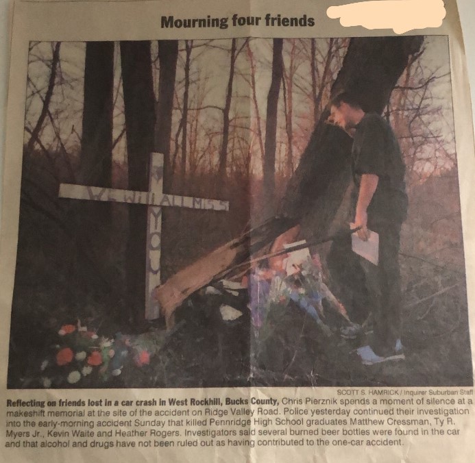 I woke up the next day and saw that there had been an accident on the news, which was rare because the Philly stations rarely paid attention to our little rural corner. Later that morning, I received the phone call delivering the news. She wasn’t even supposed to be there. She was just home for the weekend visiting her parents. She wasn’t really friends with them, but we had all known each other our entire lives so I guess she felt an obligation to go.