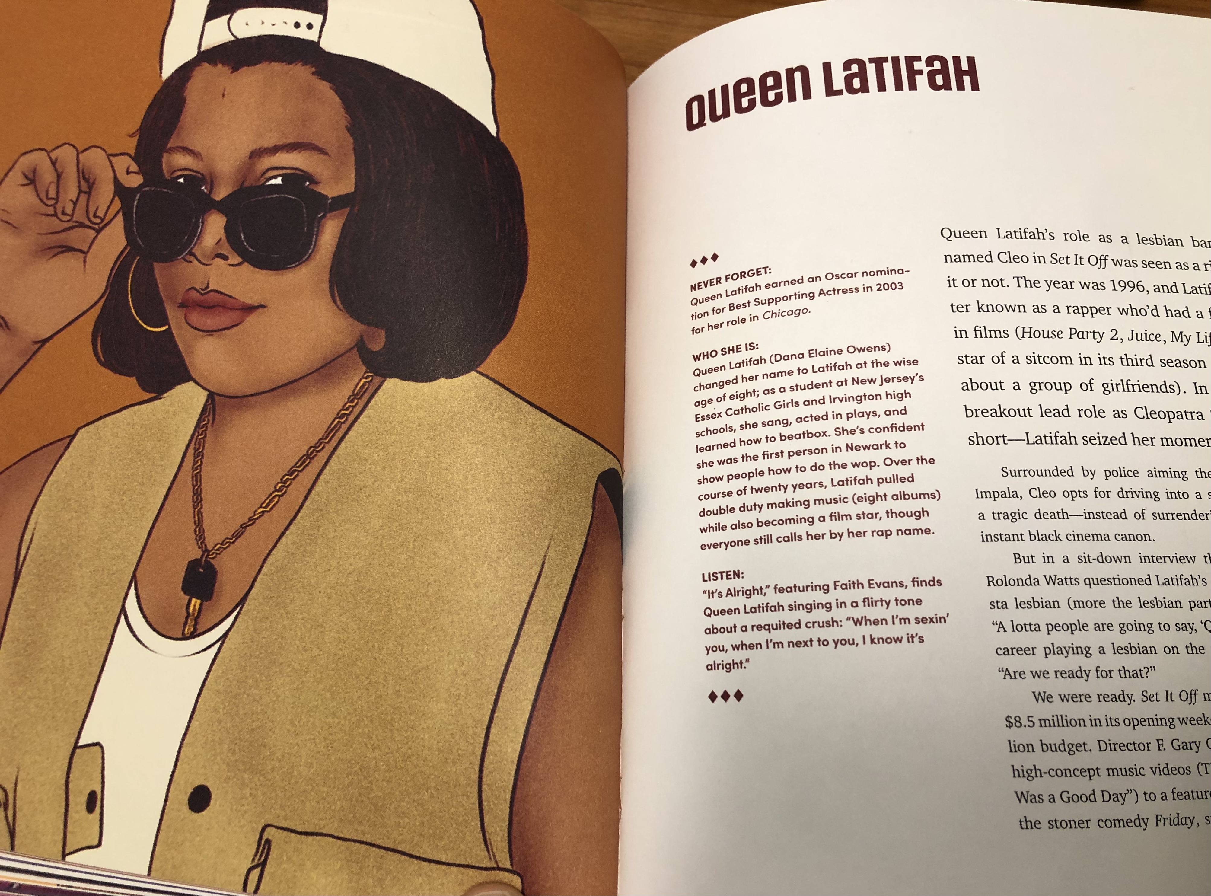 Rachelle Baker’s artwork is stellar. Each chapter is accompanied by a graphic of the artist, one that depicts her in her prime, much like a hall of fame plaque. The fashion and hairstyles represented in the portraits also serve as a visual stroll through the history of hip-hop, from baggy jeans and hats to formfitting outfits with designer labels. The illustrations pop and make it a book that deserves to be displayed even after it has been read a few times.